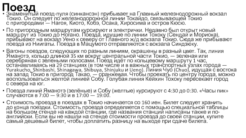 Вагоны поездов, следующих по разным линиям, окрашены в разный цвет. Так, линия Яманотэ, кольцо длиной 35 км вокруг центральной части Токио, — зеленая или серебряная с зелеными полосами. Поезд идёт по кольцевому маршруту 1 час, останавливаясь на 29 станциях (в том числе и в важных транспортных узлах города — Yurakucho, Shinbashi, Shinagawa, Shibuya, Shinjuku и Ueno). Линия Чуо (Chuo), идущая с востока на запад Токио в пригород Такао, — оранжевая. Чтобы проехать по центру города, можно воспользоваться желтой линией Собу. Голубая линия Кейхин Тохоку пересекает город с севера на юг.