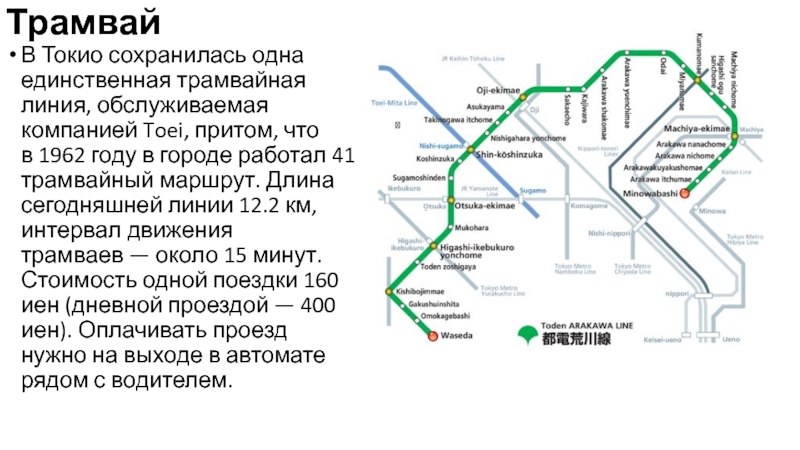 В Токио сохранилась одна единственная трамвайная линия, обслуживаемая компанией Toei, притом, что в 1962
