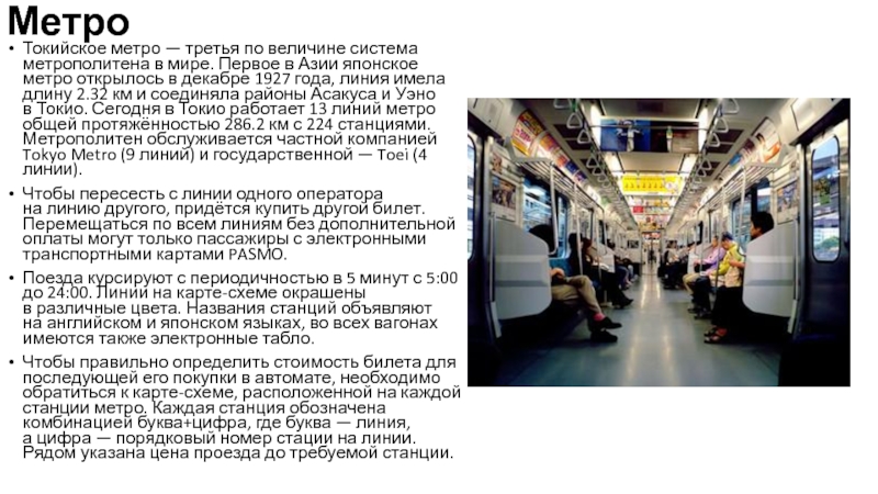Токийское метро — третья по величине система метрополитена в мире. Первое в Азии японское метро