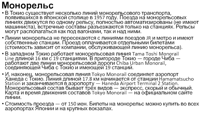 И, наконец, монорельсовая линия Tokyo Monorail соединяет аэропорт Ханеда с Токио. Линия длиной 17.8 км начинается от станции Hamamatsucho Station и заканчивается в аэропорту — Haneda Airport Terminal 2 Station. Монорельсовый состав бывает трёх видов — экспресс, скорый и обычный. Карта и время движения составов Tokyo Monorail — на официальном сайте линии.