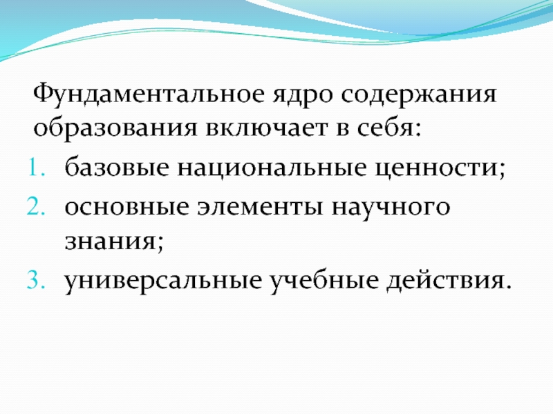Слайд 2Фундаментальное ядро содержания образования включает в себя: