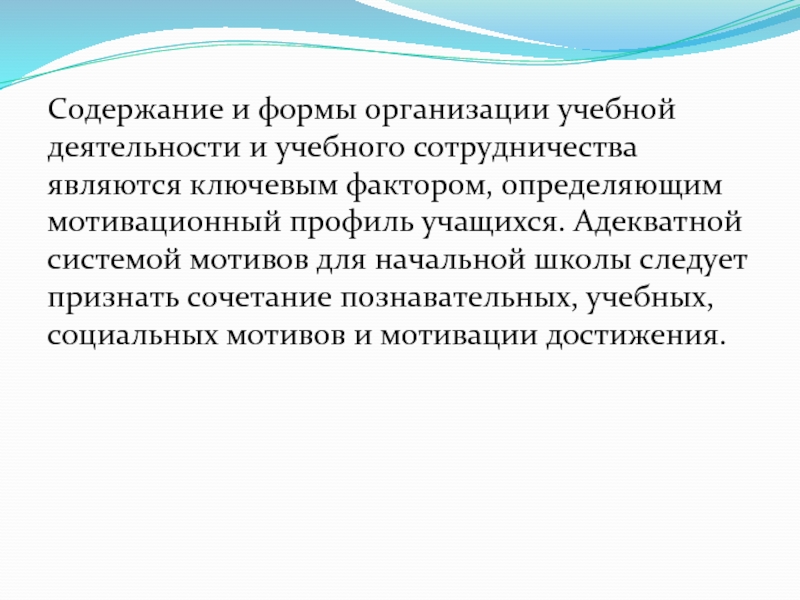 фактором, определяющим мотивационный профиль учащихся. Адекватной системой мотивов для начальной школы следует признать сочетание познавательных, учебных, социальных мотивов и мотивации достижения.