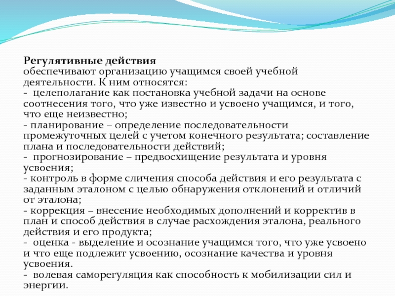 - планирование – определение последовательности промежуточных целей с учетом конечного результата; составление плана и последовательности действий;