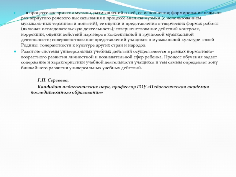 Слайд 19	в процессе восприятия музыки, размышлений о ней, ее исполнения; формирование навыков