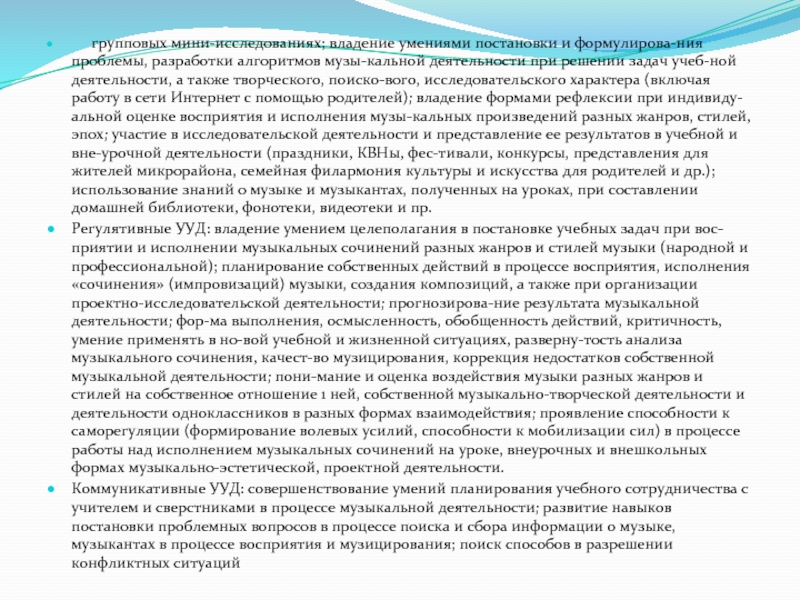 Коммуникативные УУД: совершенствование умений планирования учебного сотрудничества с учителем и сверстниками в процессе музыкальной деятельности; развитие навыков постановки проблемных вопросов в процессе поиска и сбора информации о музыке, музыкантах в процессе восприятия и музицирования; поиск способов в разрешении конфликтных ситуаций в процессе восприятия музыки, размышлений о ней, ее исполнения; формирование навыков развернутого речевого высказывания в процессе анализа музыки (с использованием музыкальных терминов и понятий), ее оценки и представления в творческих формах работы (включая исследовательскую деятельность); совершенствование действий контроля, коррекции, оценки действий партнера в коллективной и групповой музыкальной деятельности; совершенствование представлений учащихся о музыкальной культуре своей Родины, толерантности к культуре других стран и народов.