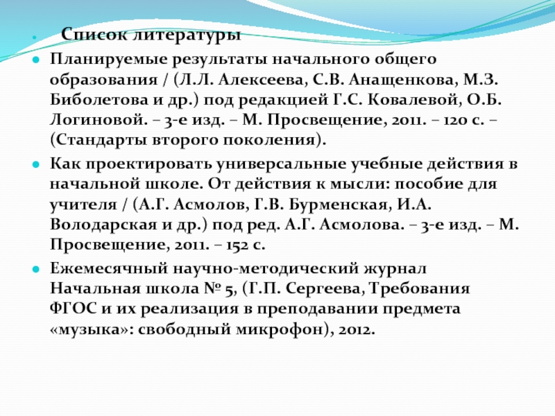 Как проектировать универсальные учебные действия в начальной школе. От действия к мысли: пособие для учителя / (А.Г. Асмолов, Г.В. Бурменская, И.А. Володарская и др.) под ред. А.Г. Асмолова. – 3-е изд. – М. Просвещение, 2011. – 152 с.
