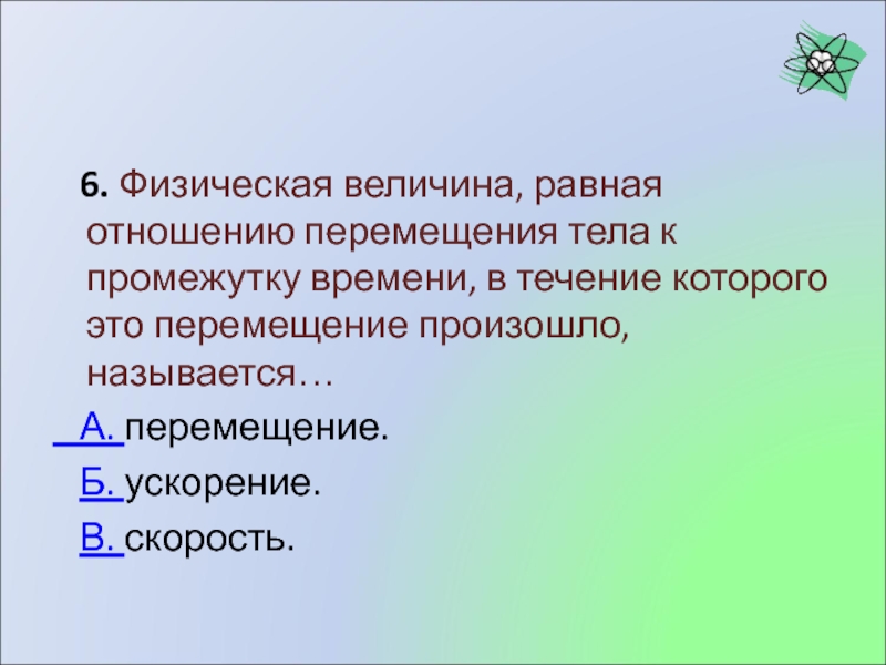 Слайд 17 6. Физическая величина, равная отношению перемещения тела к промежутку