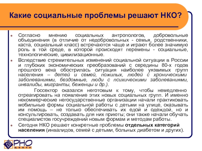 Сегодня НКО решают конкретные проблемы отдельных категорий населения (инвалидов, семей с детьми, больных диабетом и других).