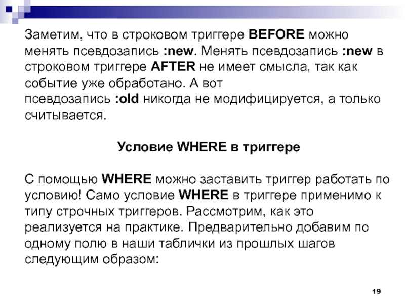Слайд 19Заметим, что в строковом триггере BEFORE можно менять псевдозапись :new. Менять псевдозапись :new в строковом