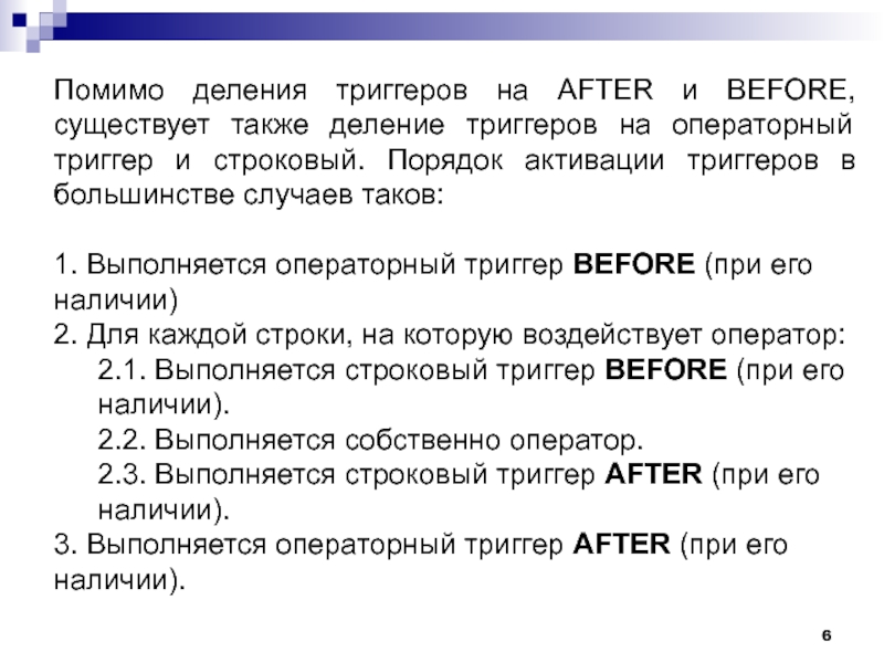 Слайд 6Помимо деления триггеров на AFTER и BEFORE, существует также деление триггеров