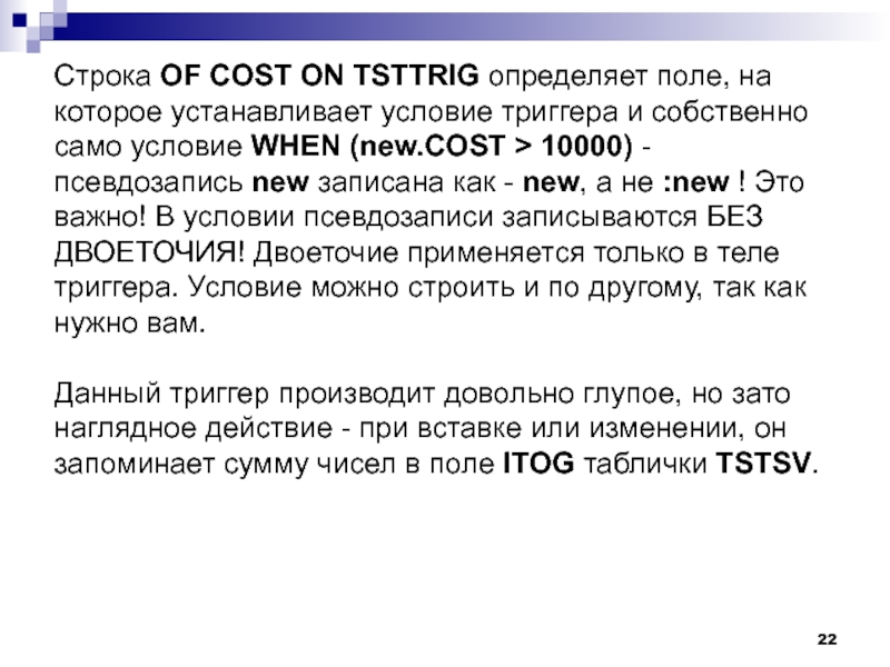 Слайд 22Строка OF COST ON TSTTRIG определяет поле, на которое устанавливает условие триггера и