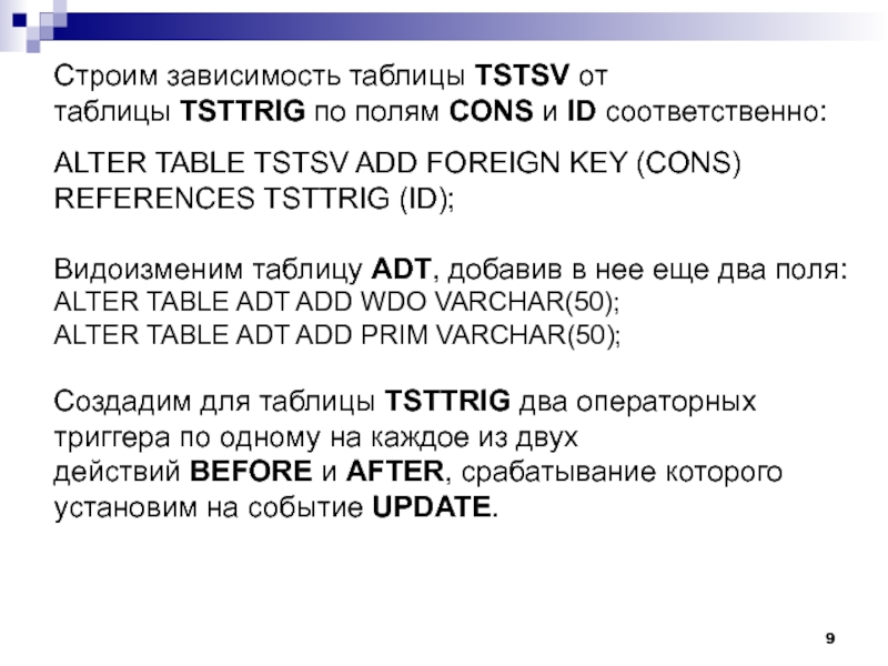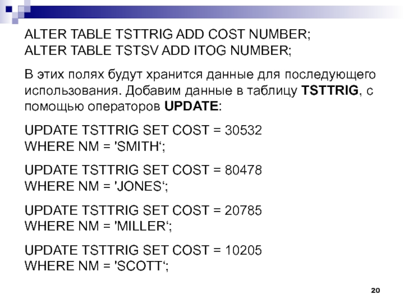 Слайд 20ALTER TABLE TSTTRIG ADD COST NUMBER;