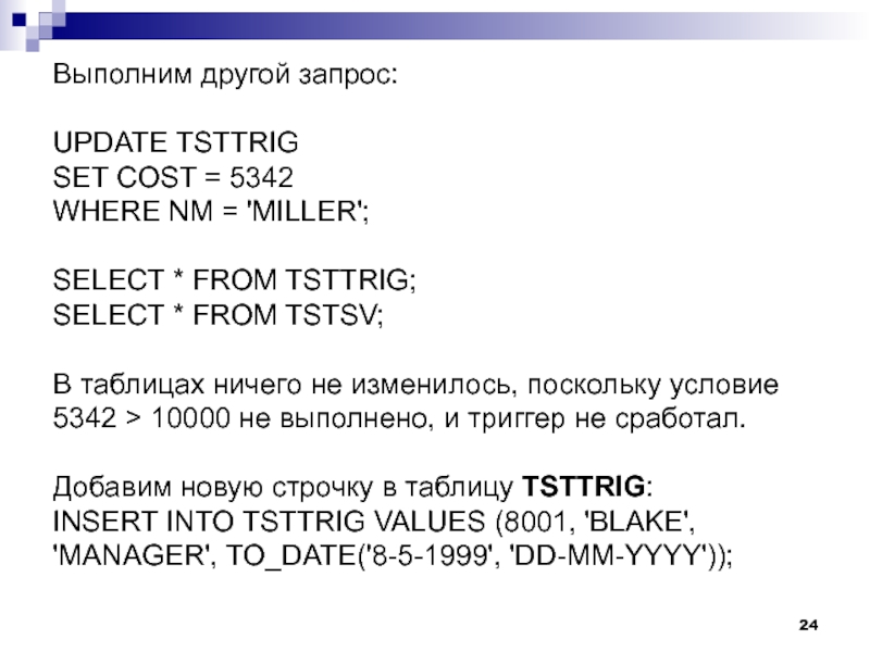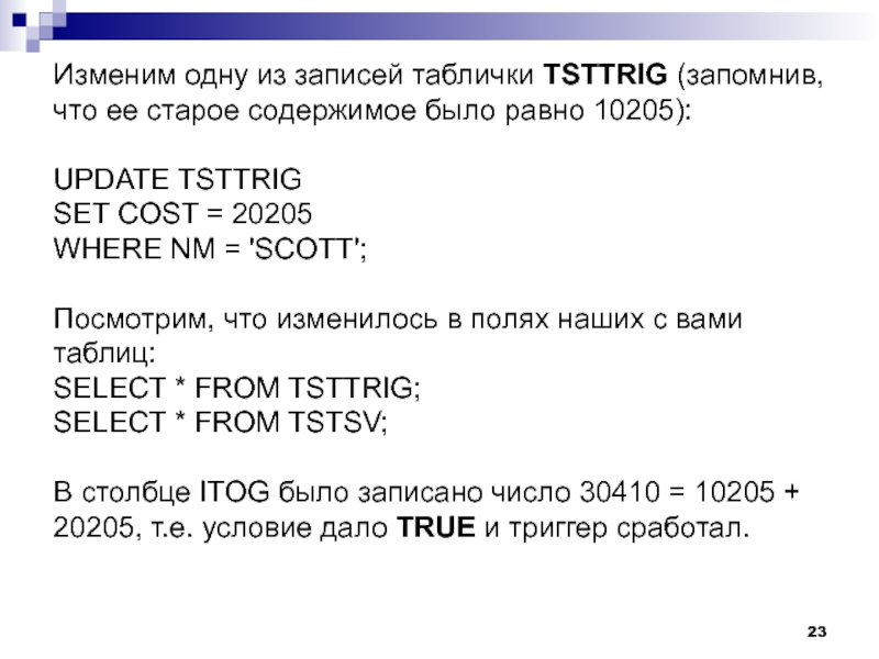 Слайд 23Изменим одну из записей таблички TSTTRIG (запомнив, что ее старое содержимое было равно