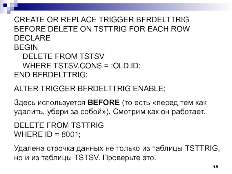 Слайд 18CREATE OR REPLACE TRIGGER BFRDELTTRIG