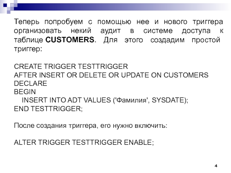 Слайд 4Теперь попробуем с помощью нее и нового триггера организовать некий аудит
