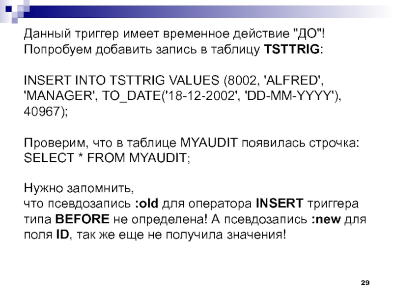 Слайд 29Данный триггер имеет временное действие "ДО"! Попробуем добавить запись в таблицу TSTTRIG: