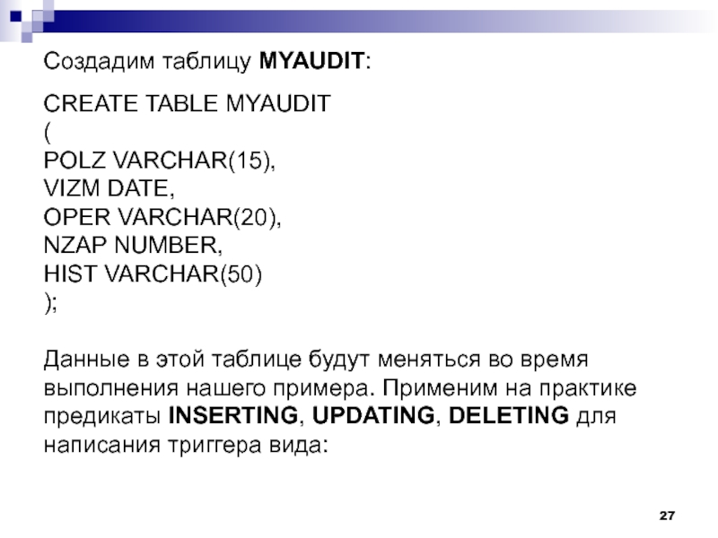 Данные в этой таблице будут меняться во время выполнения нашего примера. Применим на практике предикаты INSERTING, UPDATING, DELETING для написания триггера вида: