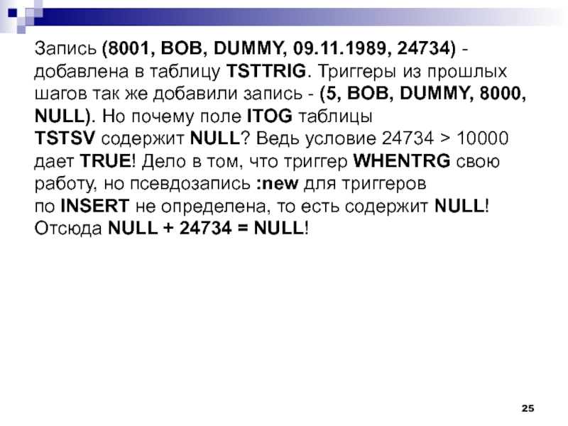 Слайд 25Запись (8001, BOB, DUMMY, 09.11.1989, 24734) - добавлена в таблицу TSTTRIG. Триггеры из прошлых