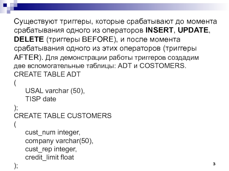 Слайд 3Существуют триггеры, которые срабатывают до момента срабатывания одного из операторов INSERT, UPDATE,