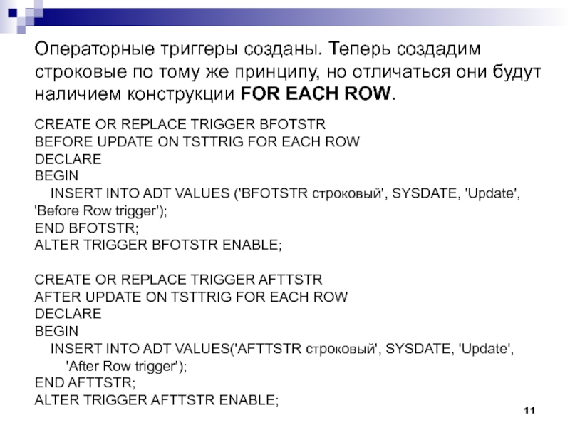 Слайд 11Операторные триггеры созданы. Теперь создадим строковые по тому же принципу, но