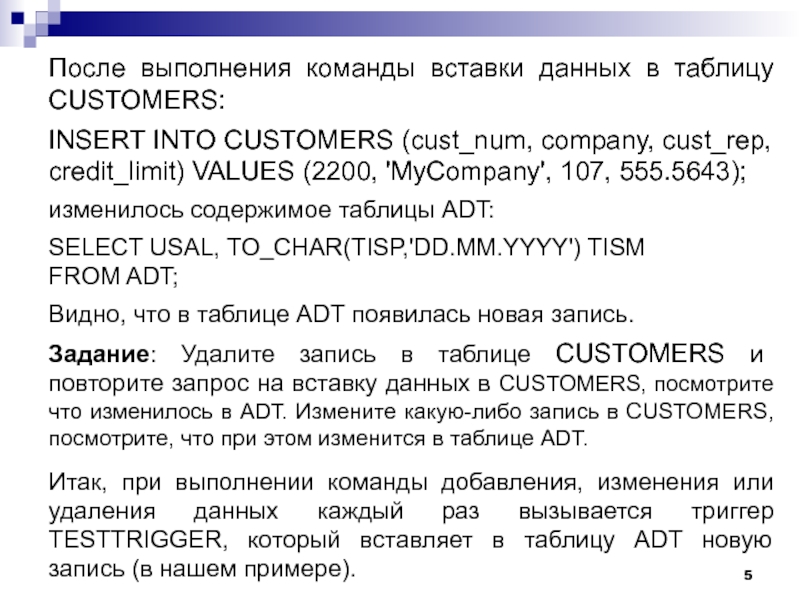 Слайд 5После выполнения команды вставки данных в таблицу CUSTOMERS: