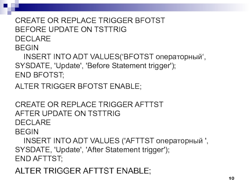 Слайд 10CREATE OR REPLACE TRIGGER BFOTST
