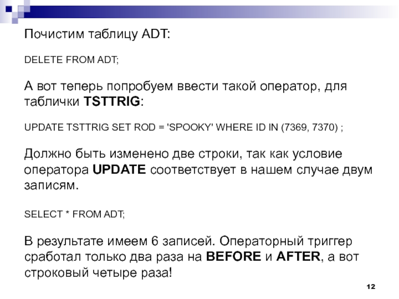 INSERT INTO ADT VALUES(‘BFOTST операторный‘, SYSDATE, 'Update', 'Before Statement trigger');