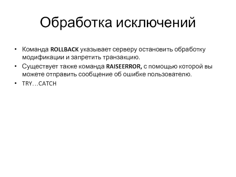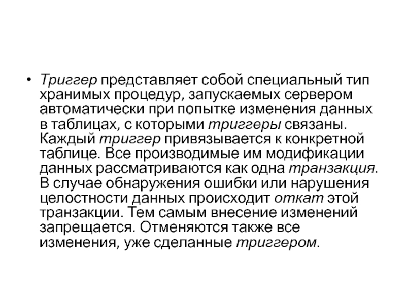 который вызывает его. Поэтому из триггера можно вызвать оператор отката, и этот оператор выполнит откат как триггера, так и соответствующего события модификации данных.