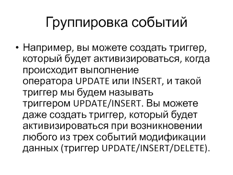 выполнение оператора UPDATE или INSERT, и такой триггер мы будем называть триггером UPDATE/INSERT. Вы можете даже создать триггер, который будет активизироваться при возникновении любого из трех событий модификации данных (триггер UPDATE/INSERT/DELETE).