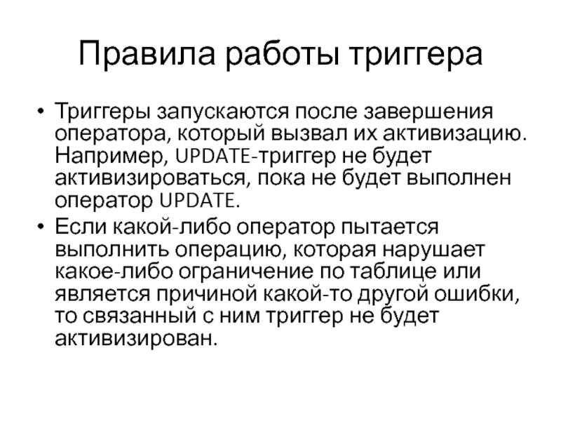 Например, UPDATE-триггер не будет активизироваться, пока не будет выполнен оператор UPDATE.