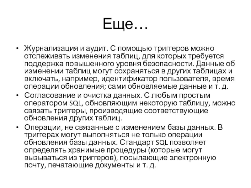 Операции, не связанные с изменением базы данных. В триггерах могут выполняться не только операции обновления базы данных. Стандарт SQL позволяет определять хранимые процедуры (которые могут вызываться из триггеров), посылающие электронную почту, печатающие документы и т. д.