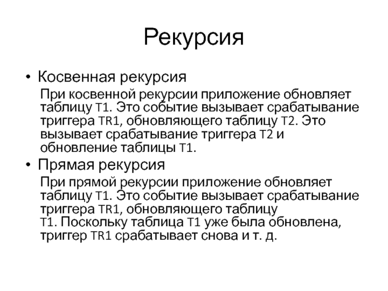 При косвенной рекурсии приложение обновляет таблицу T1. Это событие вызывает срабатывание