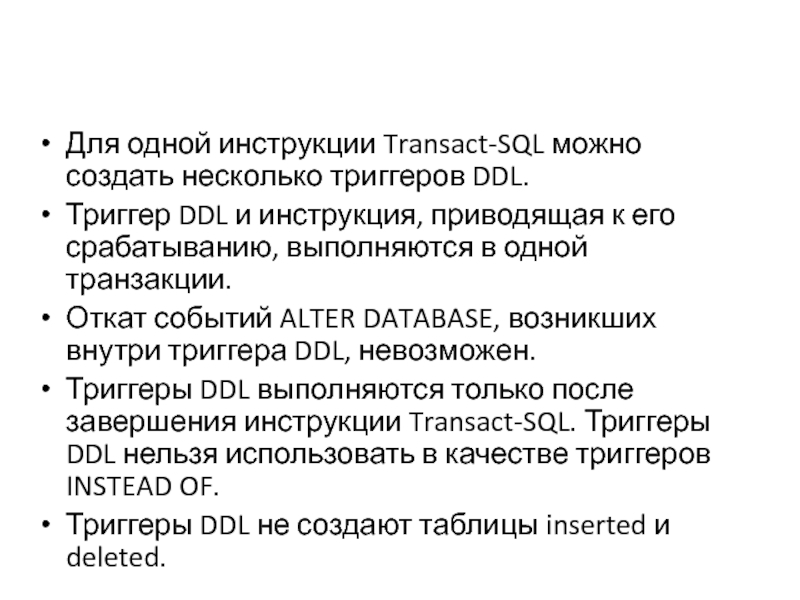Триггеры DDL выполняются только после завершения инструкции Transact-SQL. Триггеры DDL нельзя использовать в качестве триггеров INSTEAD OF.