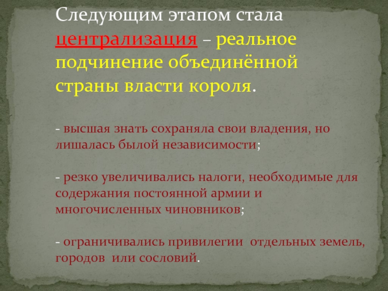 Слайд 4 Следующим этапом стала централизация – реальное подчинение объединённой страны власти короля. -
