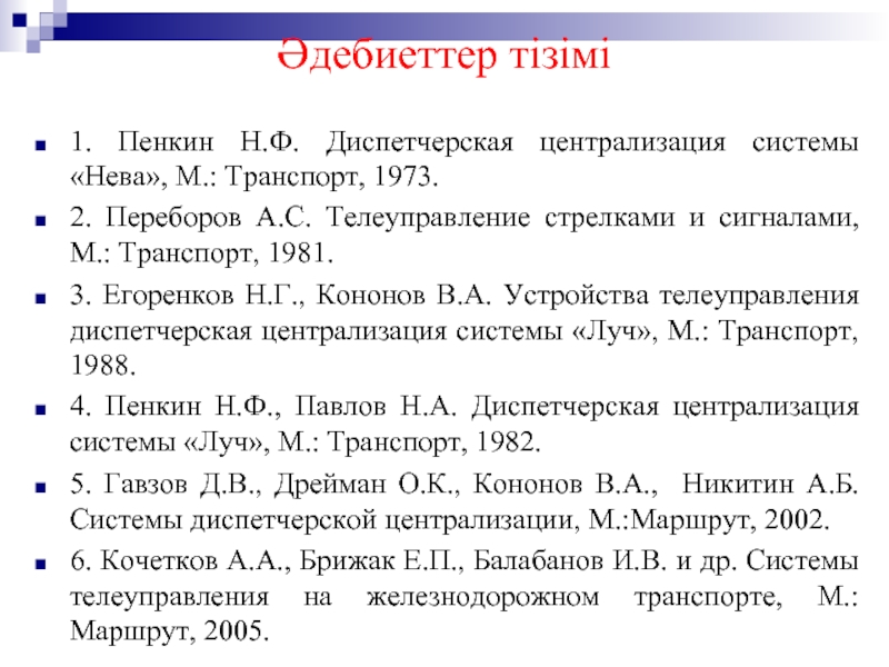 1. Пенкин Н.Ф. Диспетчерская централизация системы «Нева», М.: Транспорт, 1973.