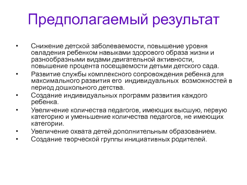 Снижение детской заболеваемости, повышение уровня овладения ребенком навыками здорового образа