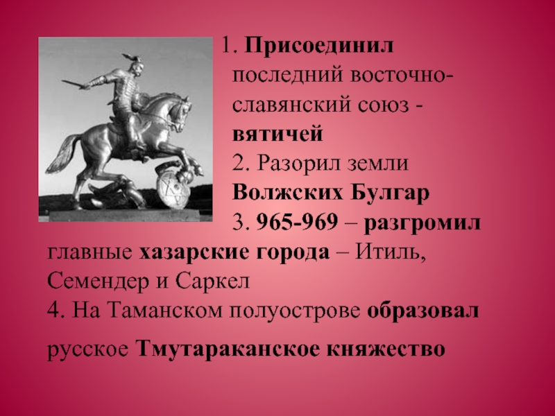 3. 965-969 – разгромил главные хазарские города – Итиль, Семендер и Саркел