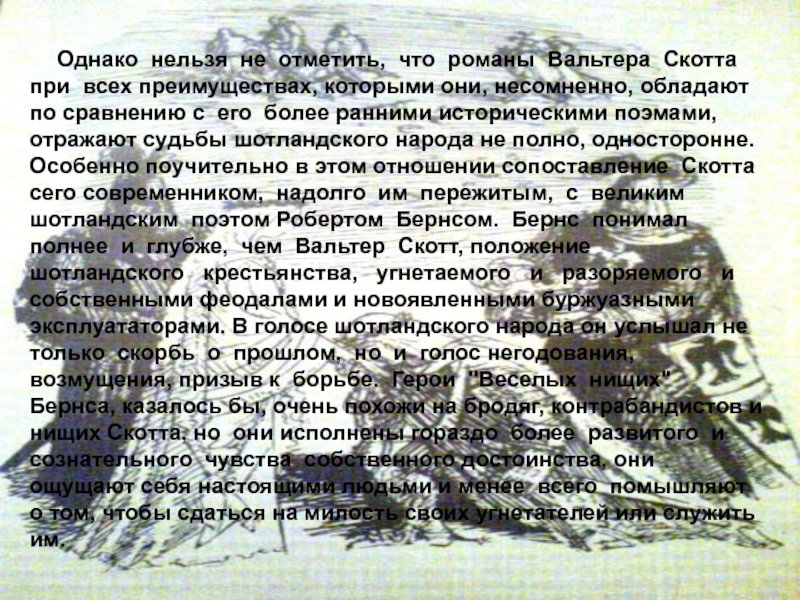 при всех преимуществах, которыми они, несомненно, обладают по сравнению с его более ранними историческими поэмами, отражают судьбы шотландского народа не полно, односторонне. Особенно поучительно в этом отношении сопоставление Скотта сего современником, надолго им пережитым, с великим шотландским поэтом Робертом Бернсом. Бернс понимал полнее и глубже, чем Вальтер Скотт, положение шотландского крестьянства, угнетаемого и разоряемого и собственными феодалами и новоявленными буржуазными эксплуататорами. В голосе шотландского народа он услышал не только скорбь о прошлом, но и голос негодования, возмущения, призыв к борьбе. Герои "Веселых нищих" Бернса, казалось бы, очень похожи на бродяг, контрабандистов и нищих Скотта, но они исполнены гораздо более развитого и сознательного чувства собственного достоинства, они ощущают себя настоящими людьми и менее всего помышляют о том, чтобы сдаться на милость своих угнетателей или служить им.