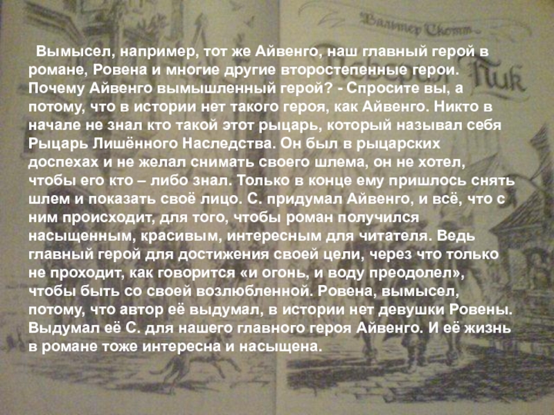 Ровена и многие другие второстепенные герои. Почему Айвенго вымышленный герой? - Спросите вы, а потому, что в истории нет такого героя, как Айвенго. Никто в начале не знал кто такой этот рыцарь, который называл себя Рыцарь Лишённого Наследства. Он был в рыцарских доспехах и не желал снимать своего шлема, он не хотел, чтобы его кто – либо знал. Только в конце ему пришлось снять шлем и показать своё лицо. С. придумал Айвенго, и всё, что с ним происходит, для того, чтобы роман получился насыщенным, красивым, интересным для читателя. Ведь главный герой для достижения своей цели, через что только не проходит, как говорится «и огонь, и воду преодолел», чтобы быть со своей возлюбленной. Ровена, вымысел, потому, что автор её выдумал, в истории нет девушки Ровены. Выдумал её С. для нашего главного героя Айвенго. И её жизнь в романе тоже интересна и насыщена.