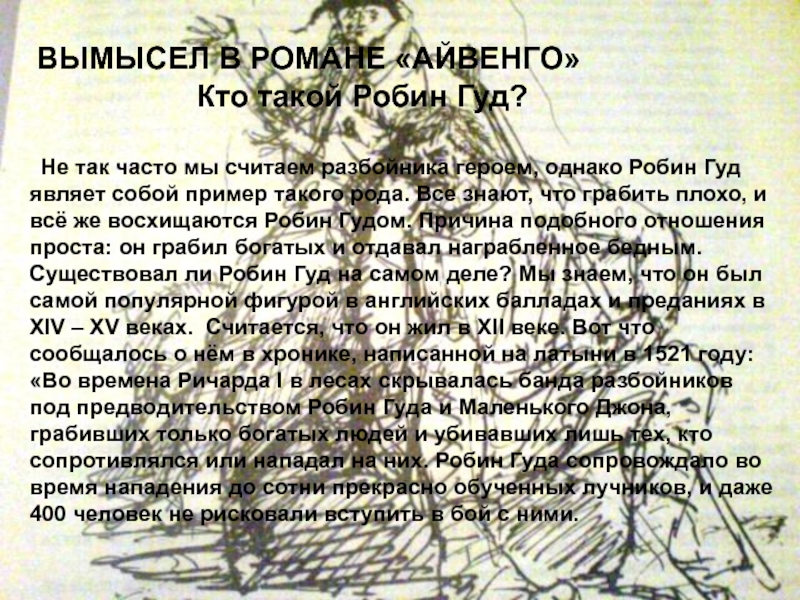 Существовал ли Робин Гуд на самом деле? Мы знаем, что он был самой популярной фигурой в английских балладах и преданиях в ХIV – ХV веках. Считается, что он жил в ХII веке. Вот что сообщалось о нём в хронике, написанной на латыни в 1521 году: