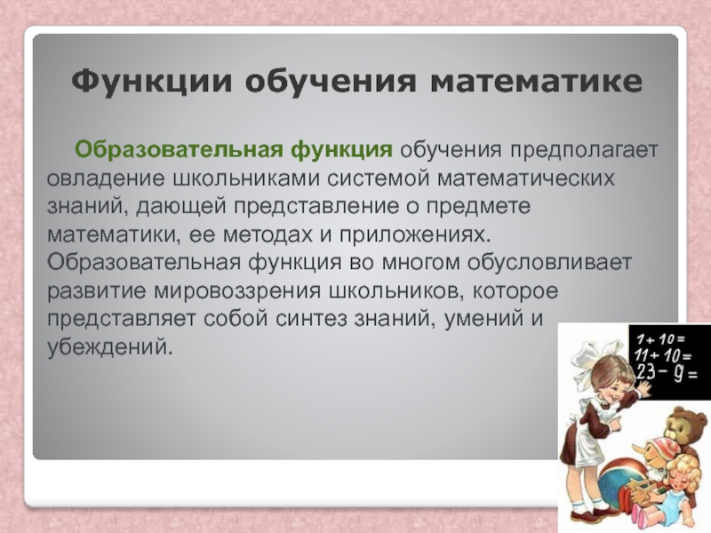 Образовательная функция обучения предполагает овладение школьниками системой математических знаний,