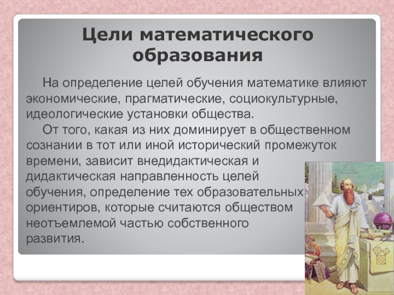На определение целей обучения математике влияют экономические, прагматические, социокультурные,