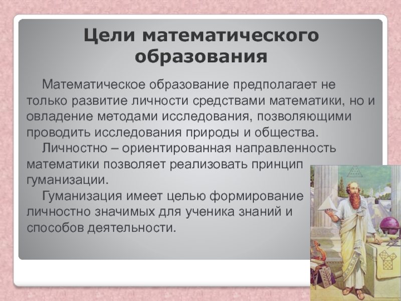 Личностно – ориентированная направленность математики позволяет реализовать принцип гуманизации.