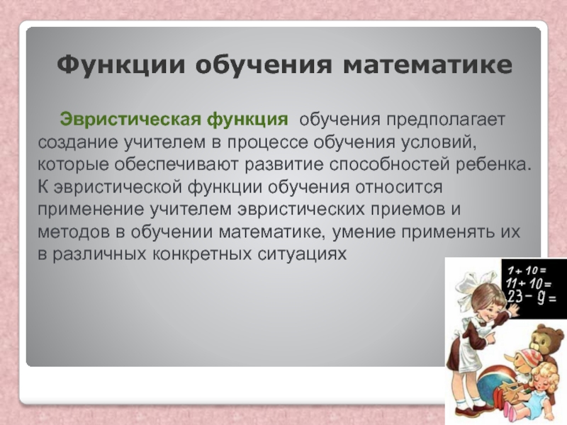 условий, которые обеспечивают развитие способностей ребенка. К эвристической функции обучения относится применение учителем эвристических приемов и методов в обучении математике, умение применять их