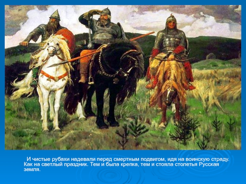 Слайд 7 И чистые рубахи надевали перед смертным подвигом, идя на воинскую страду.