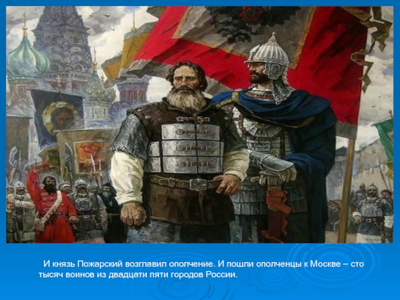 Слайд 17 И князь Пожарский возглавил ополчение. И пошли ополченцы к Москве –