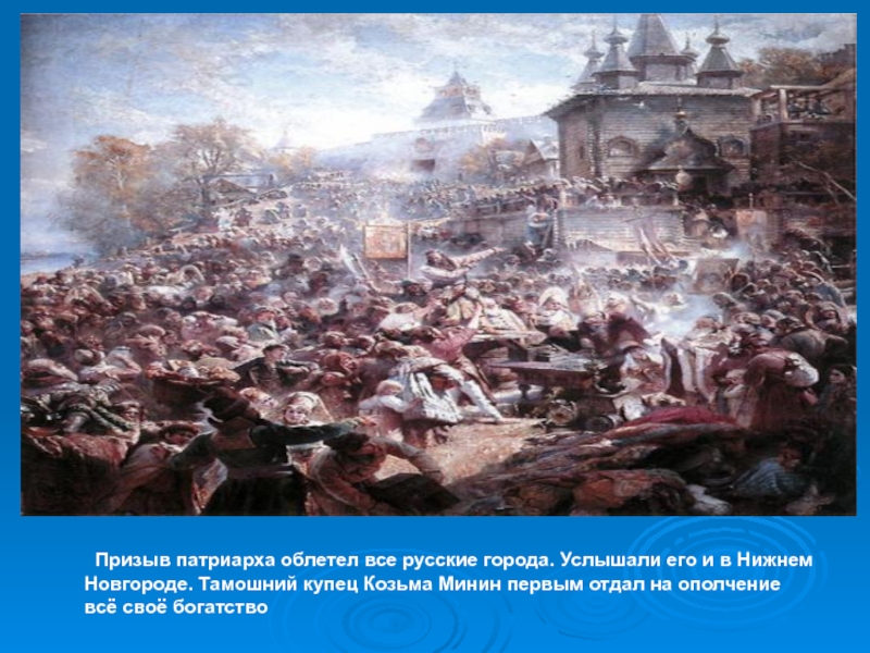 Слайд 14 Призыв патриарха облетел все русские города. Услышали его и в Нижнем