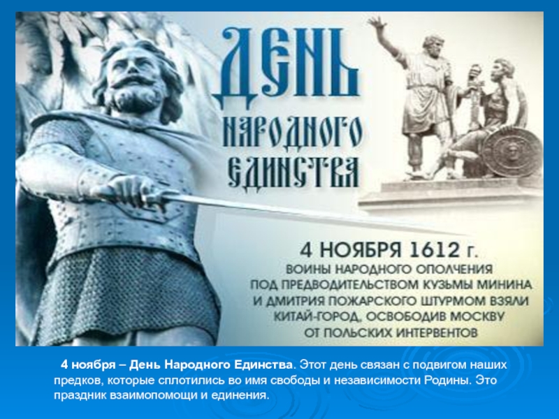 Слайд 3 4 ноября – День Народного Единства. Этот день связан с подвигом