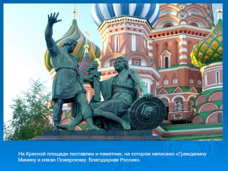 Слайд 25На Красной площади поставлен и памятник, на котором написано «Гражданину Минину