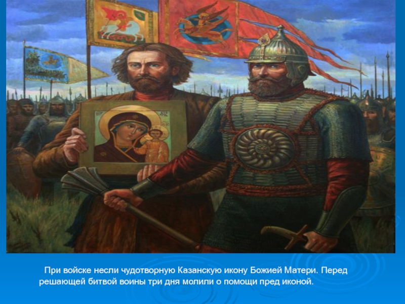 Слайд 18 При войске несли чудотворную Казанскую икону Божией Матери. Перед решающей битвой